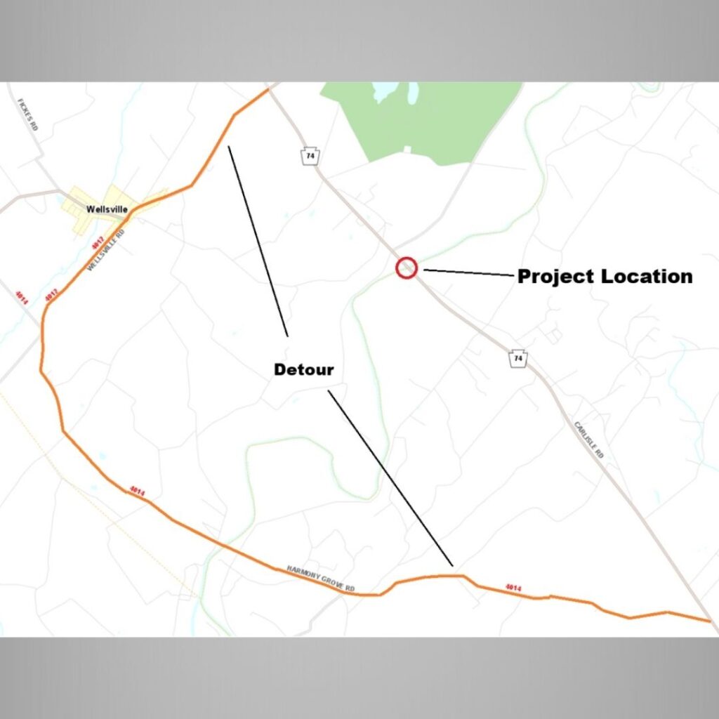 Weather permitting, the bridge will be closed Monday, January 12. A detour of up to 240 days will be in place using Harmony Grove Road (Route 4014), Wellsville Road (Route 4012) and Route 74 (Carlisle Road). The new bridge is expected to open to traffic by September 9, 2026.